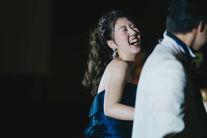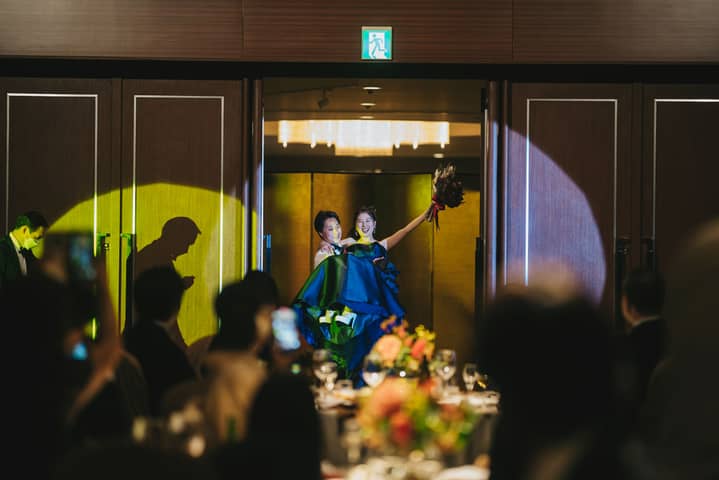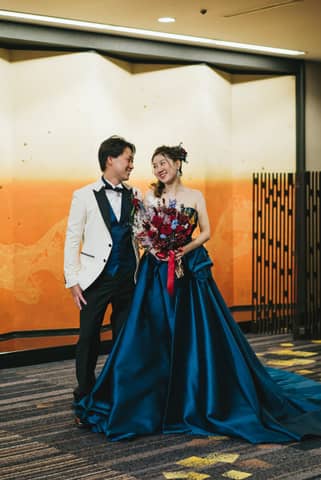 お色直しは落ち着いたブルーのドレスでガラッとイメージチェンジ。
