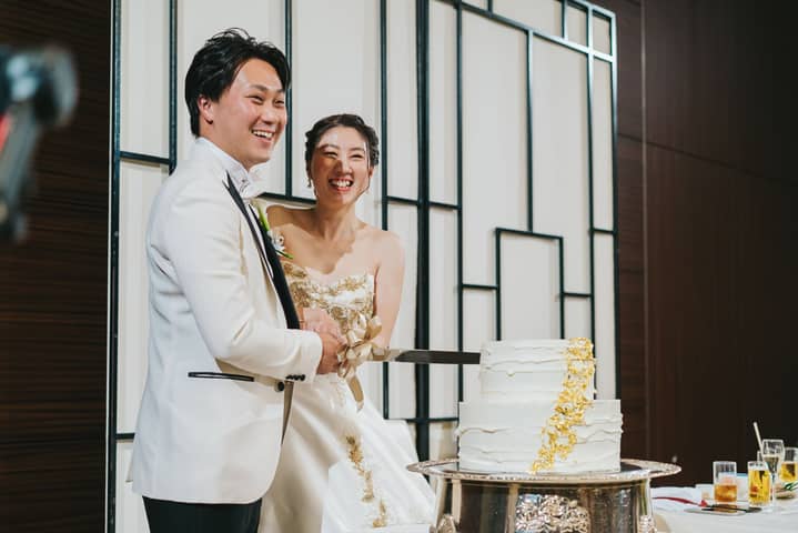 ドレスの雰囲気に合わせてオーダーされたウェディングケーキは金箔でシンプルだけどゴージャス。
