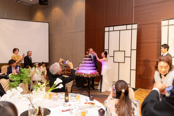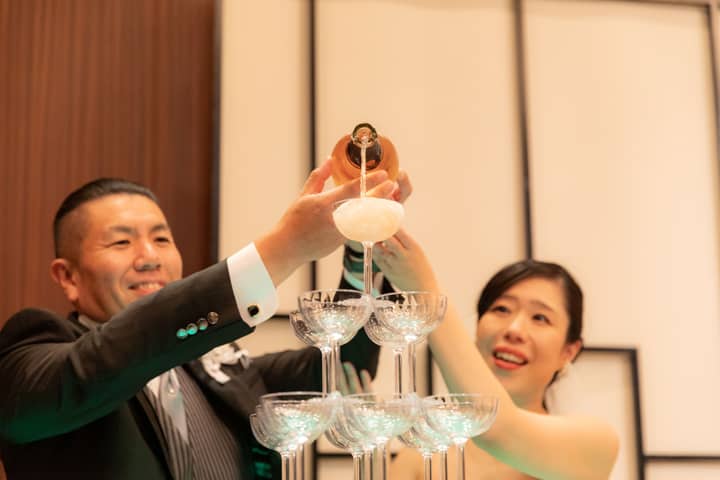 再入場と合わせてお二人が選ばれたのは「シャンパンタワー」のセレモニー。