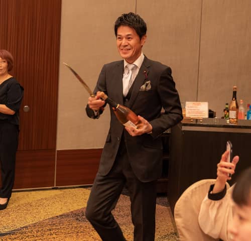 メインテーブルに到着した後は新郎のお世話になっているご友人による「シャンパンサーベル」のセレモニーがはじまります。
